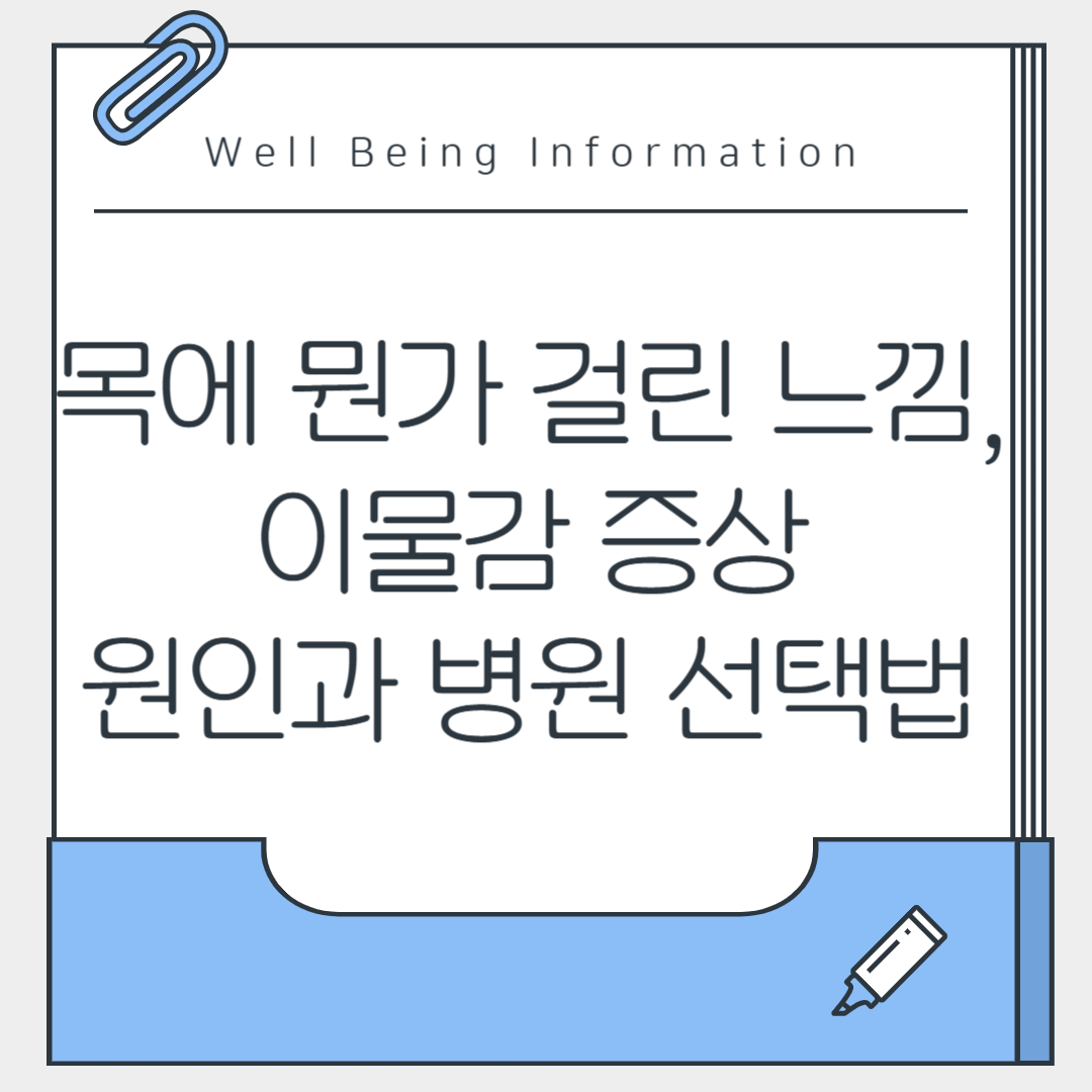 목에 뭔가 걸린 듯한 이물감은 단순한 불편함이 아니라 인후두 역류, 편도염, 갑상선 문제 등 다양한 건강 문제의 신호일 수 있습니다. 증상이 반복되거나 심해진다면 이비인후과 또는 내과를 방문해 정확한 진단을 받으세요. 평소 식습관과 스트레스 관리를 통해 목 건강을 지키는 습관은 전신 건강에도 도움이 됩니다. 내 몸이 보내는 작은 신호를 놓치지 마세요!
